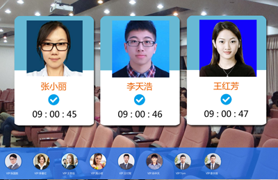 会议签到:系统可添加会议信息并配置相应参会人员,开启会议签到功能后,参会人员可进行到会考勤,平台自动统计考勤数据,实时更新至班牌终端,生成会议参会人员的到勤率。