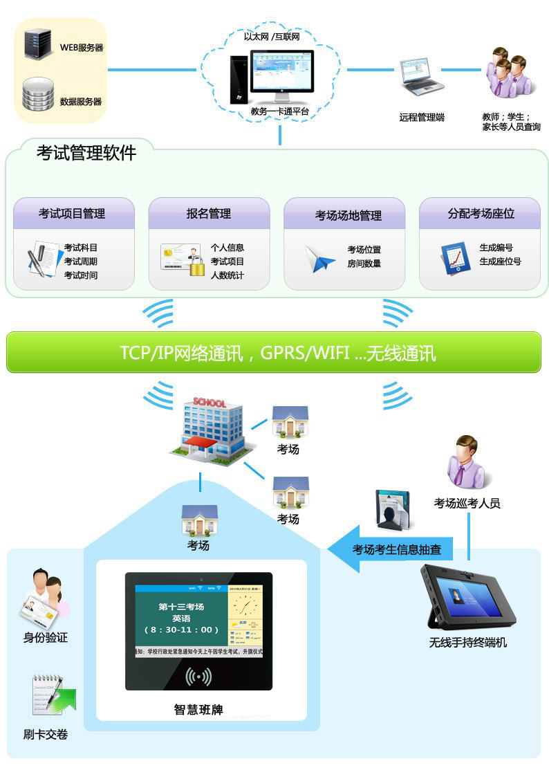 显示考场信息(考试科目、考场位置、考试时间、监考老师)、考前统计考生信息(应到人数、实到人数、迟到人数、未到人数等信息)、开考后统计未参加考试名单。